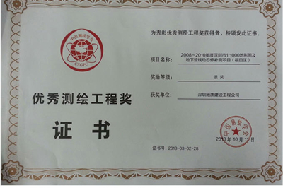 MORE>近日,深圳地建公司完成的两个测绘项目,2008-2010年度深圳市1:1000地形图及地下管线动态修补测项目(福田区)和2010年度惠州市大亚湾经济技术开发区1:500基础测绘(包四),分别获2013年中国测绘学会全国优秀测绘工程银奖和铜奖。 ..